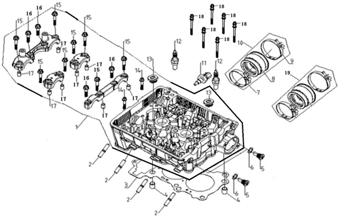 Купить запчасти - Головка цилиндра от двигателя KEL500F совместим с Мотоцикл VOGE CU525TE. Всего 17 позиций.