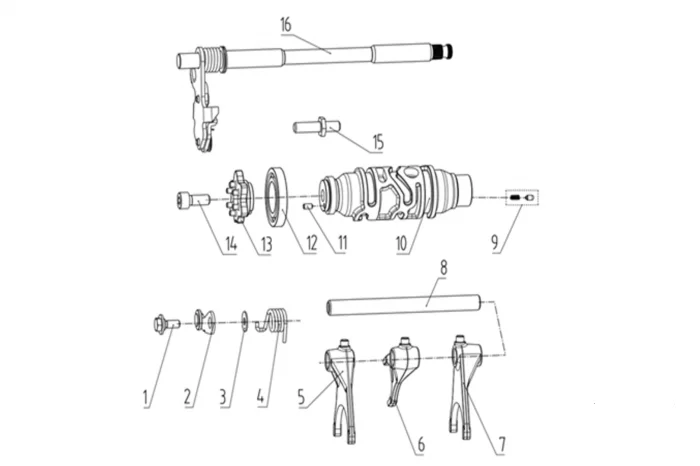Купить запчасти - Вал копирный с вилками от двигателя KEV600 совместим с Мотоцикл VOGE CU625. Всего 16 позиций.